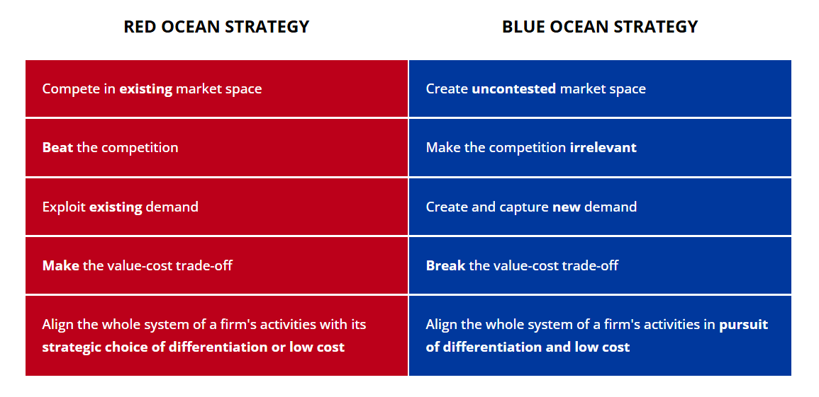 Their core idea is that most companies compete in âred oceansâ full of sharks, fighting over a shrinking pool of customers. The alternative is to create âblue oceansâ of uncontested market space.